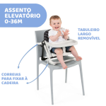 Primeira cadeira (12-36 m): ao retirar o tabuleiro e os cintos, o banco elevatório pode ser transformado numa cadeira confortável a ser colocada no chão, que pode ser usada durante o recreio ou quando se relaxa.