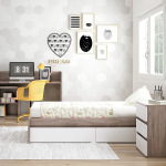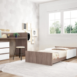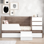 Quando o bebé cresce, a Combi Cool é convertida numa cama 190×90 cm com inspiração Montessori para promover a sua autonomia, permitindo-lhe subir e descer sozinho, e a secretária e as duas mesinhas são perfeitas para o seu espaço de leitura e jogos.