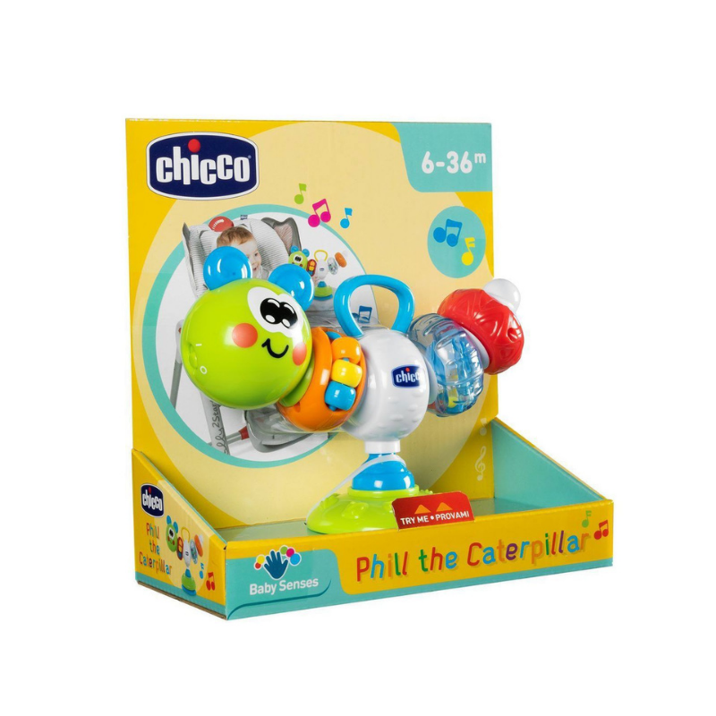 A lagarta Phill foi desenvolvida pela Chicco para entreter a criança durante a hora da refeição com atividades manuais e sons divertidos!