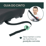 Inclui uma guia de passagem para a correia diagonal, ajustável em altura, para garantir a correta passagem do cinto sobre o ombro da criança.