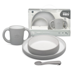 utensílios de mesa especialmente concebidos para facilitar a alimentação do bebé. É composto por uma tigela de grande capacidade, um prato fundo, um copo com grandes pegas de fácil aderência e uma colher ergonómica com um gancho anti-queda.