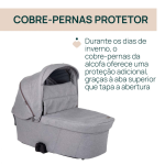 COBRE-PERNAS PROTETOR: Durante os dias de inverno, o cobre-pernas da alcofa oferece uma proteção adicional, graças à aba superior que tapa a abertura. Inclui ímanes para uma abertura rápida, permitindo colocar e retirar o bebé com facilidade.