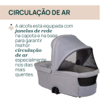 ÓTIMA CIRCULAÇÃO DE AR: A alcofa está equipada com janelas em rede na capota e na base para garantir a melhor circulação de ar, especialmente nos dias mais quentes. O bebé irá manter-se fresco e confortável, mesmo em condições climáticas mais exigentes.
